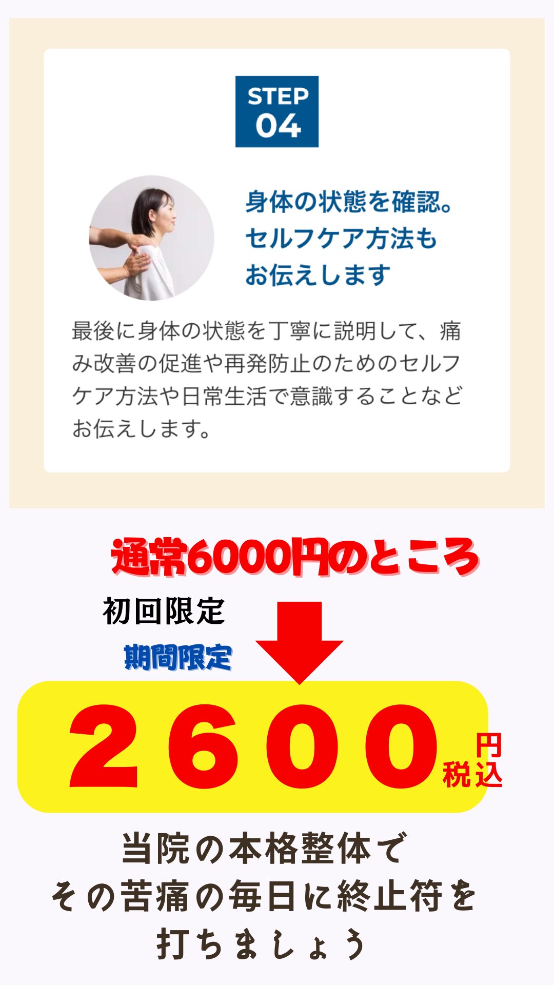 慢性疲労改善整体コース40分 肩こり腰痛クーポン2600円
