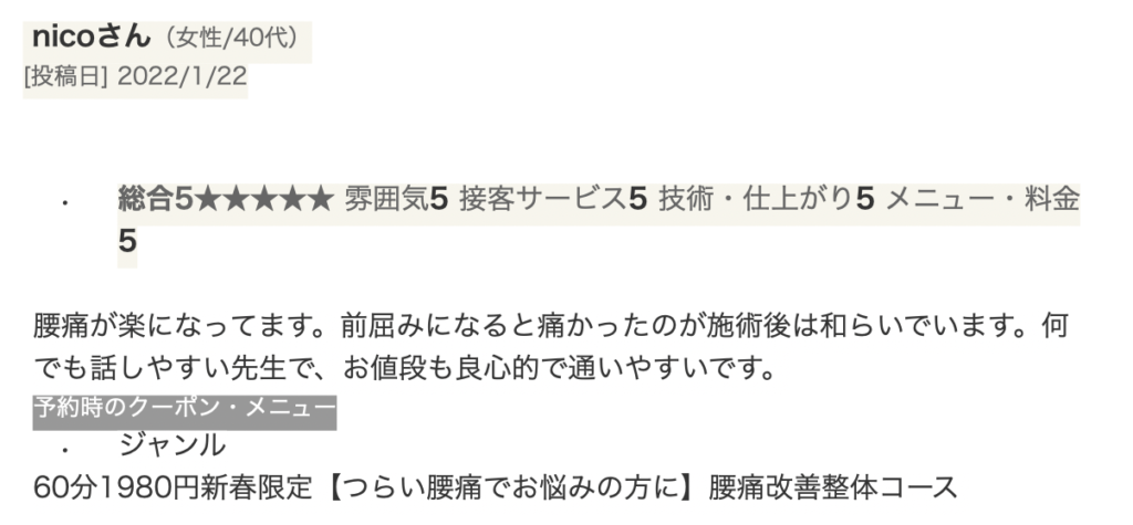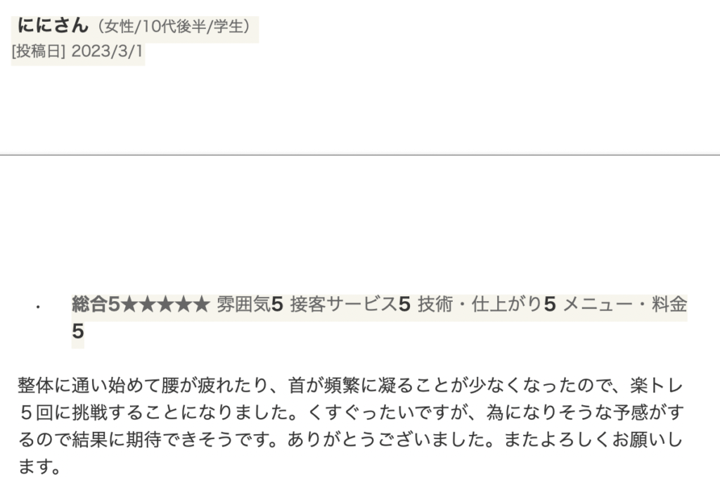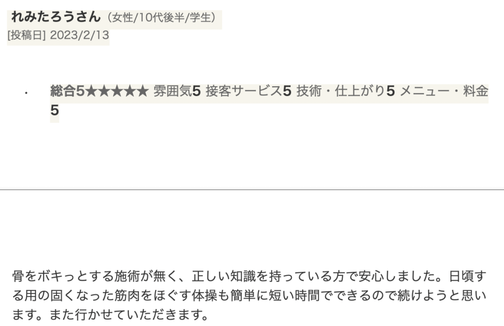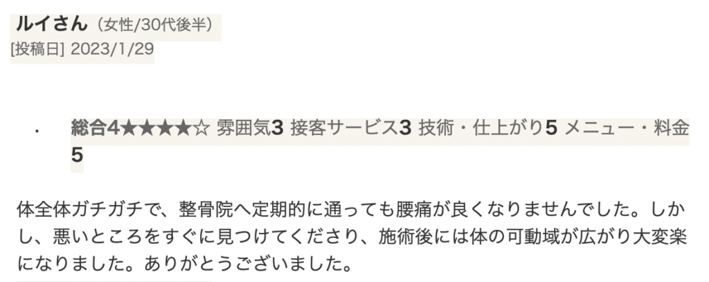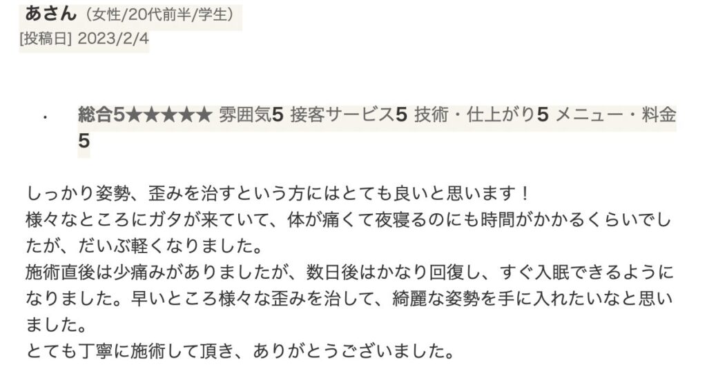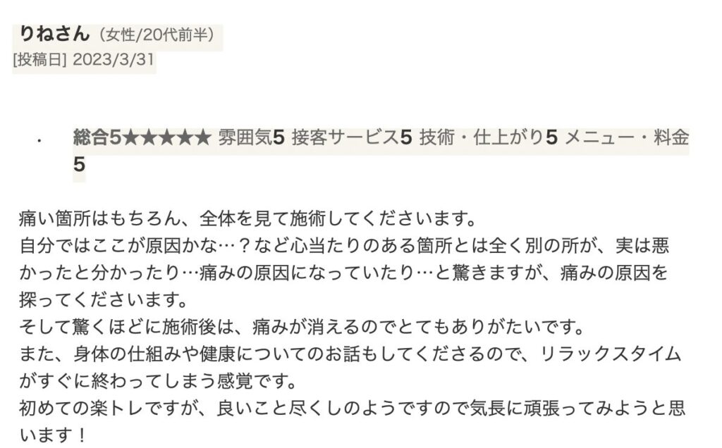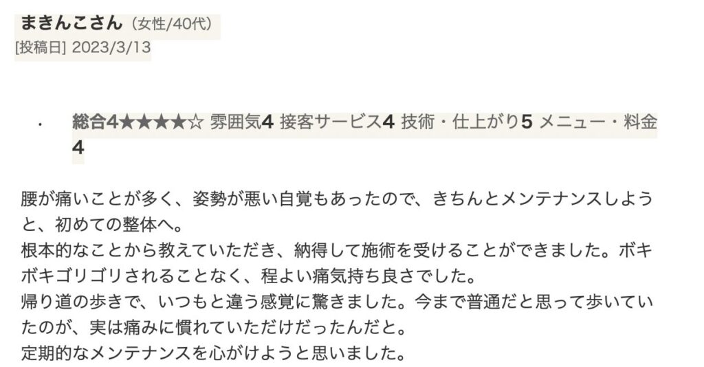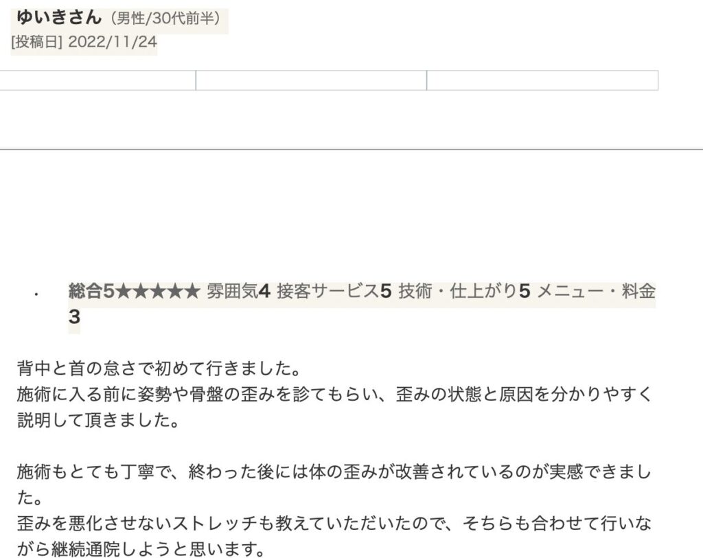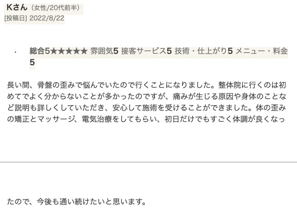 ずっと骨盤矯正したいと思っていたけど行けなかったのですが‥行って良かったです!!色々とこうしたらいいと説明もしてくれてわかりやすかったし自分の身体が思っていた以上に酷いこともわかりました!値段もかなり良心的!!これ以上酷くならない為にも通いたいと思います!