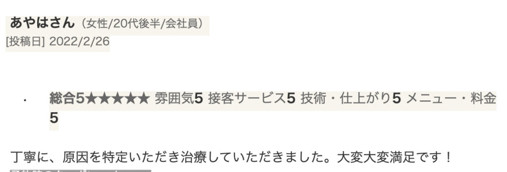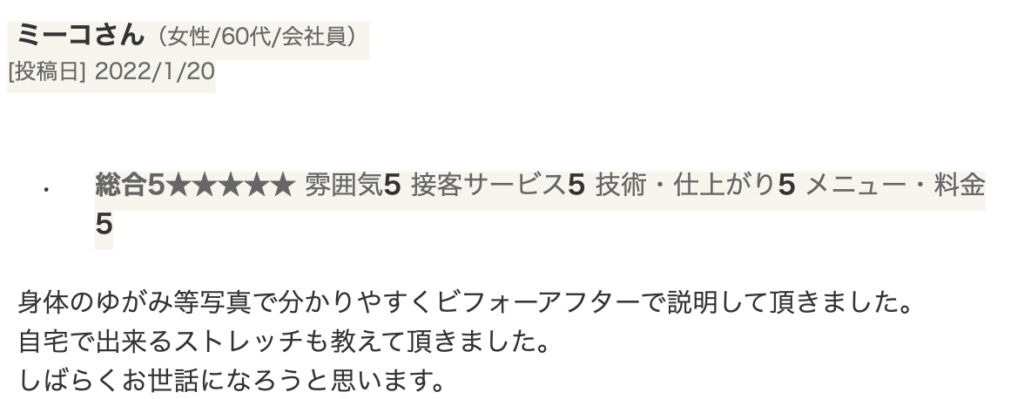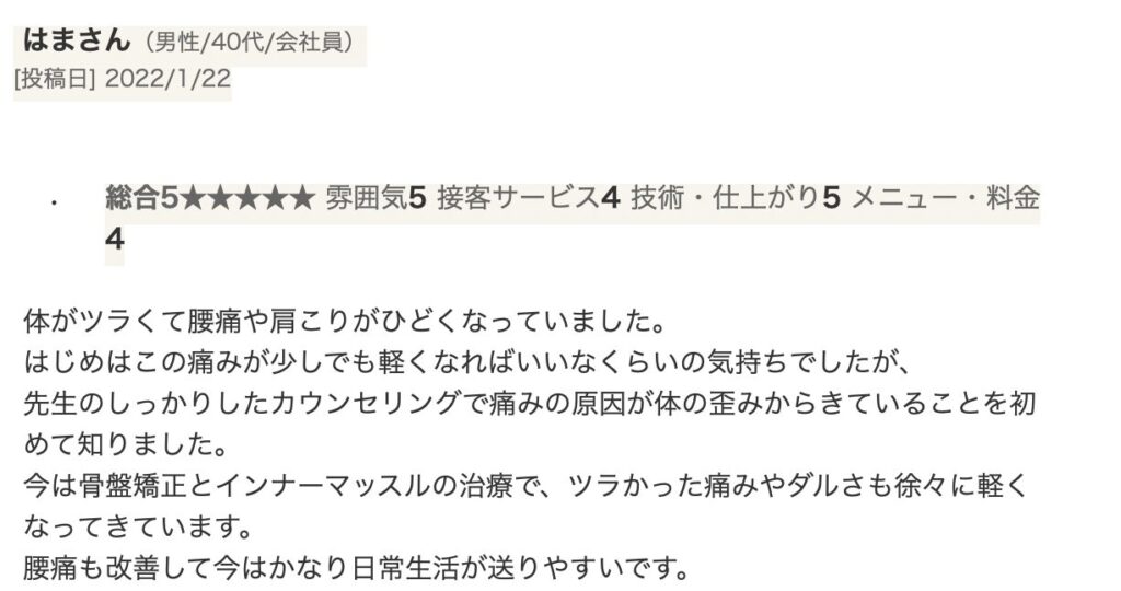 骨盤矯正以外もいろいろわたしの体の気になる部分を改善していただきました。