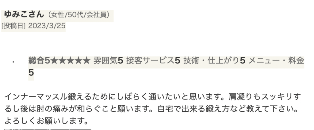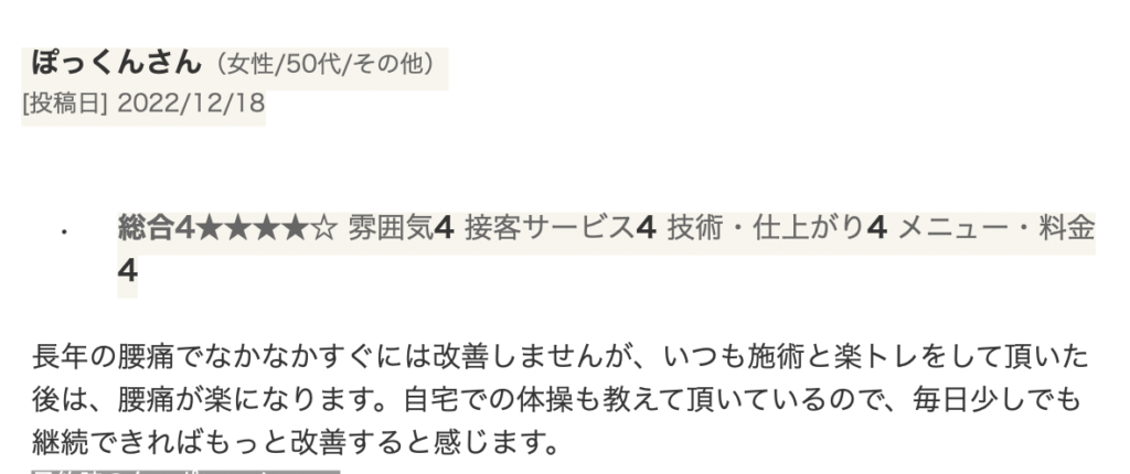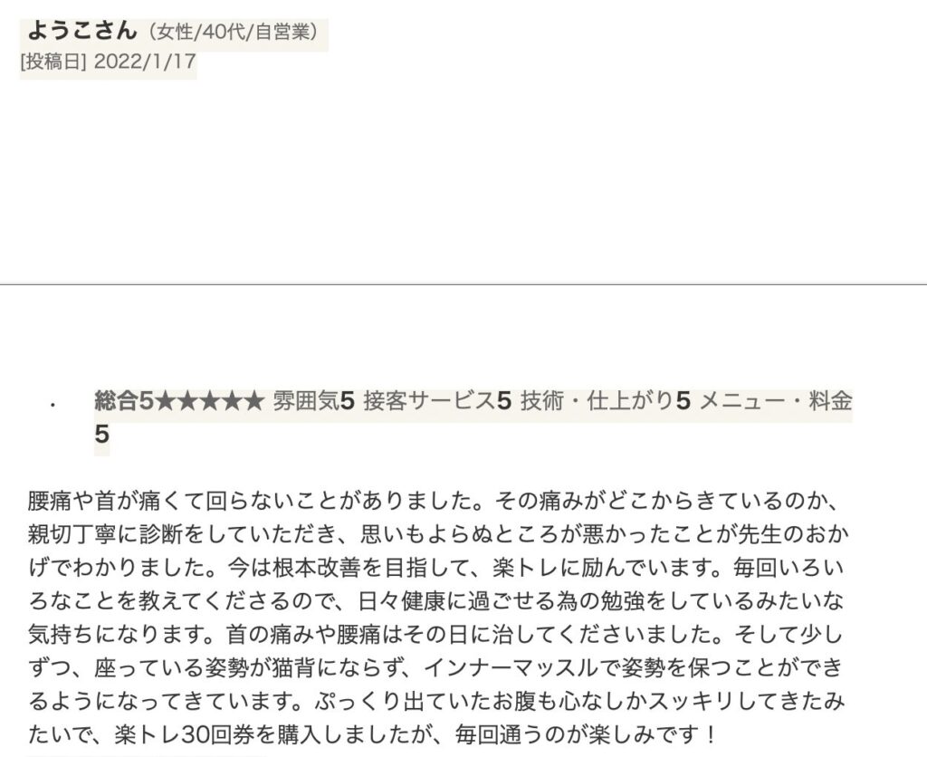 40代後半に突入して猫背を指摘されることが増えて解決策もなく忙しさで先延ばしにしていましたが、こちらでインナーマッスルの大切さを丁寧に教えてくださり、納得の施術。翌日、矯正サポーターを付けてるような、自然に背中が伸びる感じが心地よく、二回目伺いました。仕事帰りに行けることが通いやすいので、ちょっとトレーニングする感覚かもしれません。その日の不調を治して頂きながら正しい姿勢に直すことで健康的な意識で過ごせそうです。